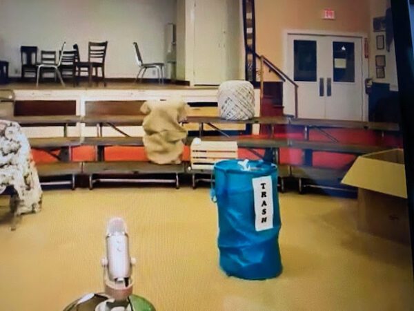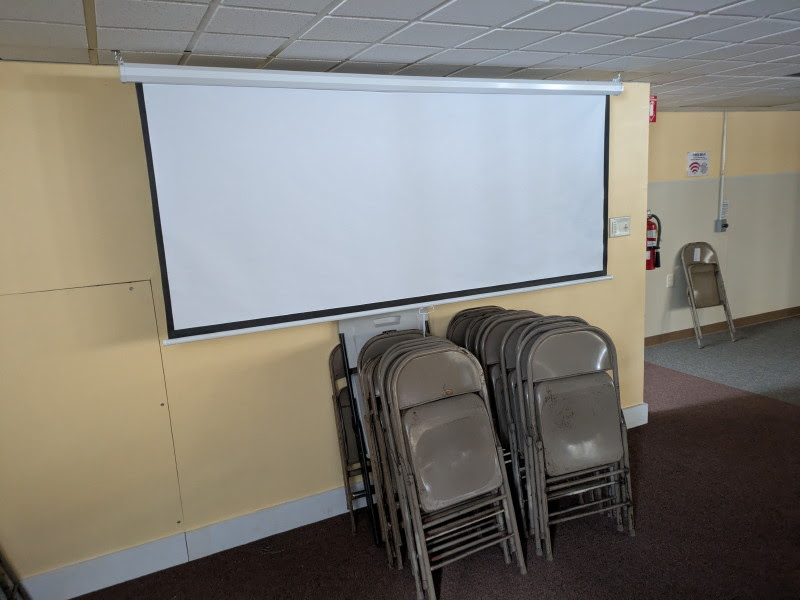 e upstairs, being sold on locally for $25! Recently, I installed some chains to make 2 locations for hanging the screen: in the “center aisle” for folks in the cafeteria section, and in the “coffee-house alcove”, for smaller meetings and gatherings. We think they will be useful for various group sizes, and will make the downstairs even more attractive to renters. Want to hold a movie night? Show pictures from your hike on the Appalachian Trail (as recently happened upstairs)? Email Merry to make arrangements!
