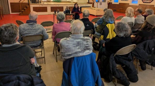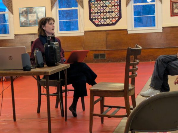 We had a good turnout, on Feb. 7, to hear Erica Heilman, who produces her award-winning podcast from her home in East Calais. She spoke about her individual approach to interviewing and podcasting from a chair, with her laptop on her knees so that she could play clips from her show. The first was one from her friend and fellow podcaster Scott Carrier, reading selections from the Montpelier & Barre police logs; she played several others during her talk. She also shared her good memories of when she rented our Grange Hall for her 50th birthday party…
