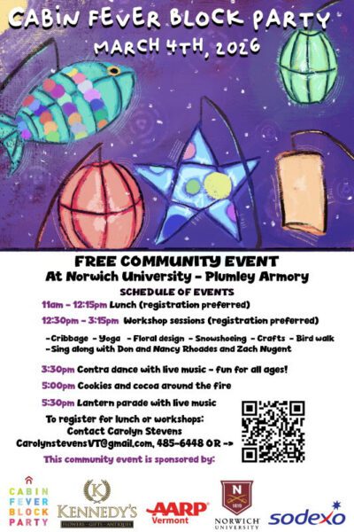 As you’ll see on the poster, everyone is welcome for this event, starting with the FREE lunch at 11:30 AM. Then, all afternoon we’re providing a wide variety of “workshops“, in Plumley Armory of Norwich University, and outdoors as well, during the afternoon. And we’re having a Contra Dance for the community from 3:30 to 5:00 PM. The dance will feature calling by Mary Wesley, a regular caller at the “Montpelier Contra Dance” series at the Grange Hall–as well as all over New England and the whole U.S. Live music will be provided by “Frosty Frog”, a Plainfield band which includes Macey Mayfield on fiddle, and Erik Pendleton on guitar; they come highly recommended.