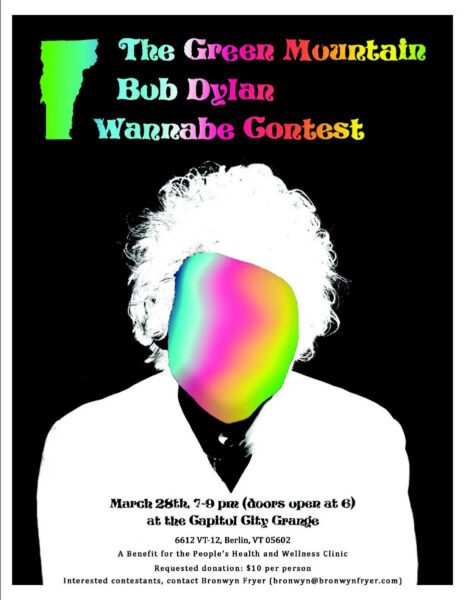 Last year, the benefit “Green Mountain Bob Dylan Wannabe Contest” at the Grange raised about $2,500 for the People’s Health & Wellness Clinic in Barre. We’re sponsoring the contest again this year, by providing our Grange Hall, and we hope you will attend, enjoy and donate! Put March 28 on your calendar!
