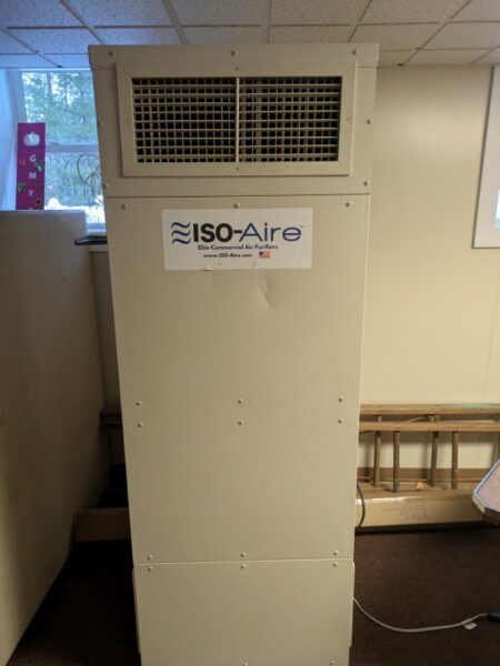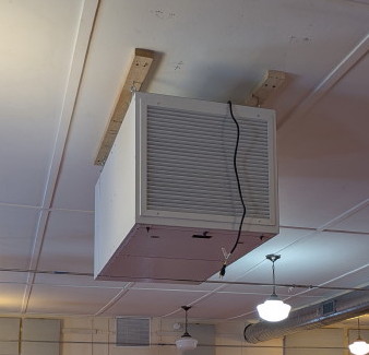 In 2025, we purchased an Iso-Aire air purifier, which (like the ceiling-mounted unit in the Main Hall) filters 500 cu. ft./minute of the indoor air through a HEPA 99.9% filter. This unit is programmed to run during all rentals of the Lower Level.