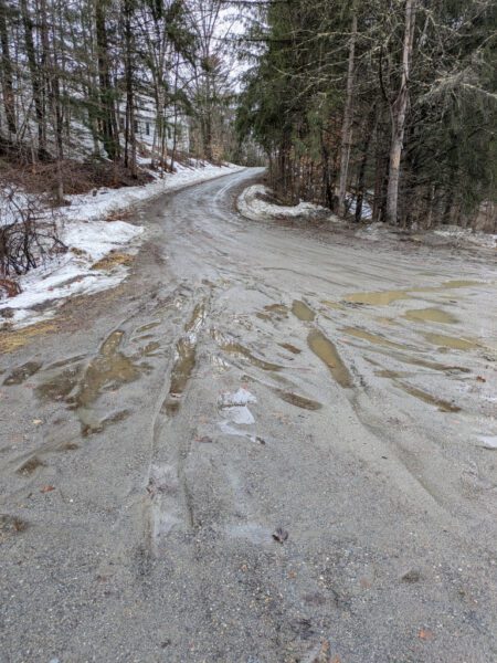 Because March always reminds us that the only constant is change, this snapshot shows a muddy moment that will soon pass away. As it probably is wherever you are reading this, the remaining snow is retreating every day…at least until the next snowstorm. This spot is just off the driveway to the Hall. The driveway itself has remained in quite good shape–kudos once again to the repairs done by contractor Matt Dwire, last done in 2023!